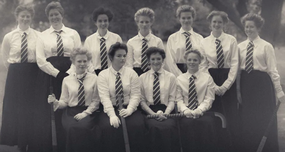 Photo from 2017 East Grand Rapids field hockey team recreating 1905 game of Radcliffe vs. Bryn Mawr